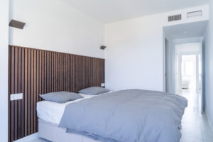 The master bedroom is equipped with a 180×200 bed, and the other two bedrooms have a 160×200 bed and two simple 90×200 beds, respectively.